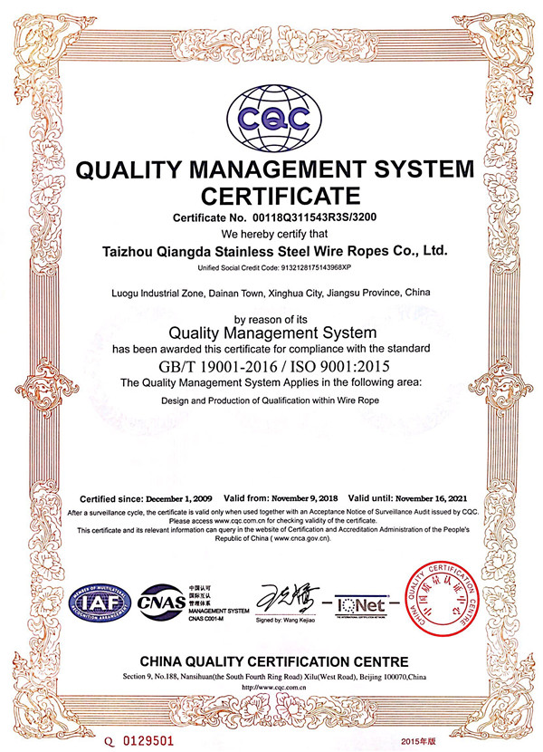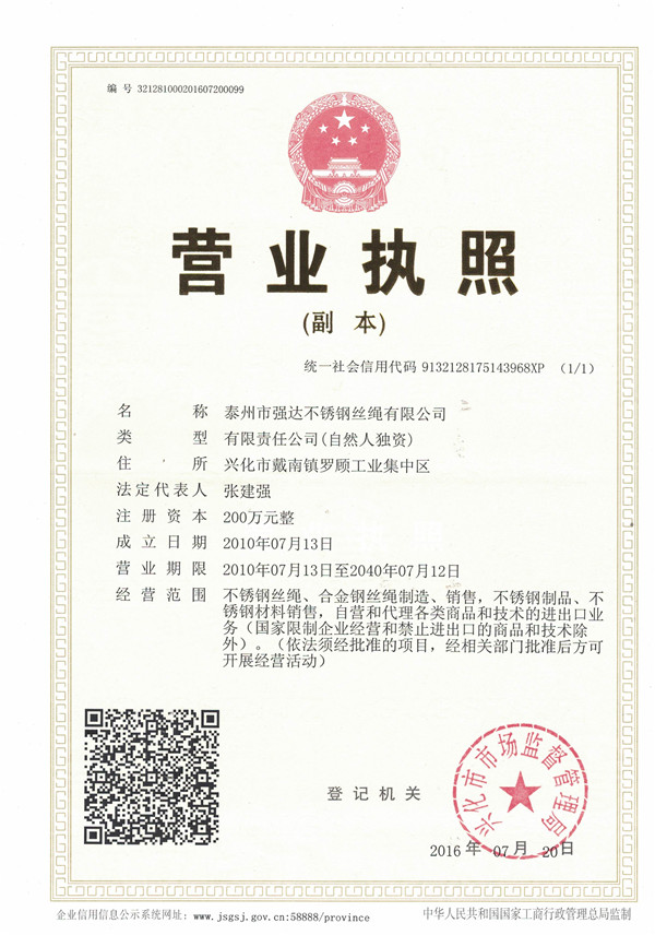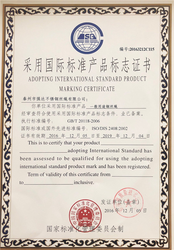 泰州市強達(dá)不銹鋼絲繩有限公司位于江蘇興化市戴南經(jīng)濟開發(fā)區(qū),公司致力于不銹鋼絲繩產(chǎn)品生產(chǎn),立志成為“國內(nèi)技術(shù)標(biāo)桿型吊索具生產(chǎn)企業(yè)”。以此戰(zhàn)略思想指導(dǎo),公司堅決貫徹“質(zhì)量贏市場,管理增效益,誠信贏天下”的質(zhì)量方針。以完善的服務(wù)在國內(nèi)不銹鋼絲繩市場樹立良好的品牌形象。公司榮獲“江蘇省質(zhì)量信得過企業(yè)。 靈活的管理機制,經(jīng)驗豐富的